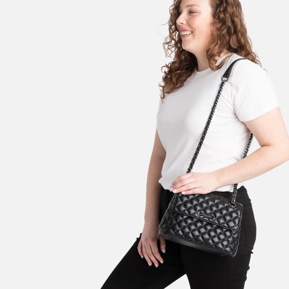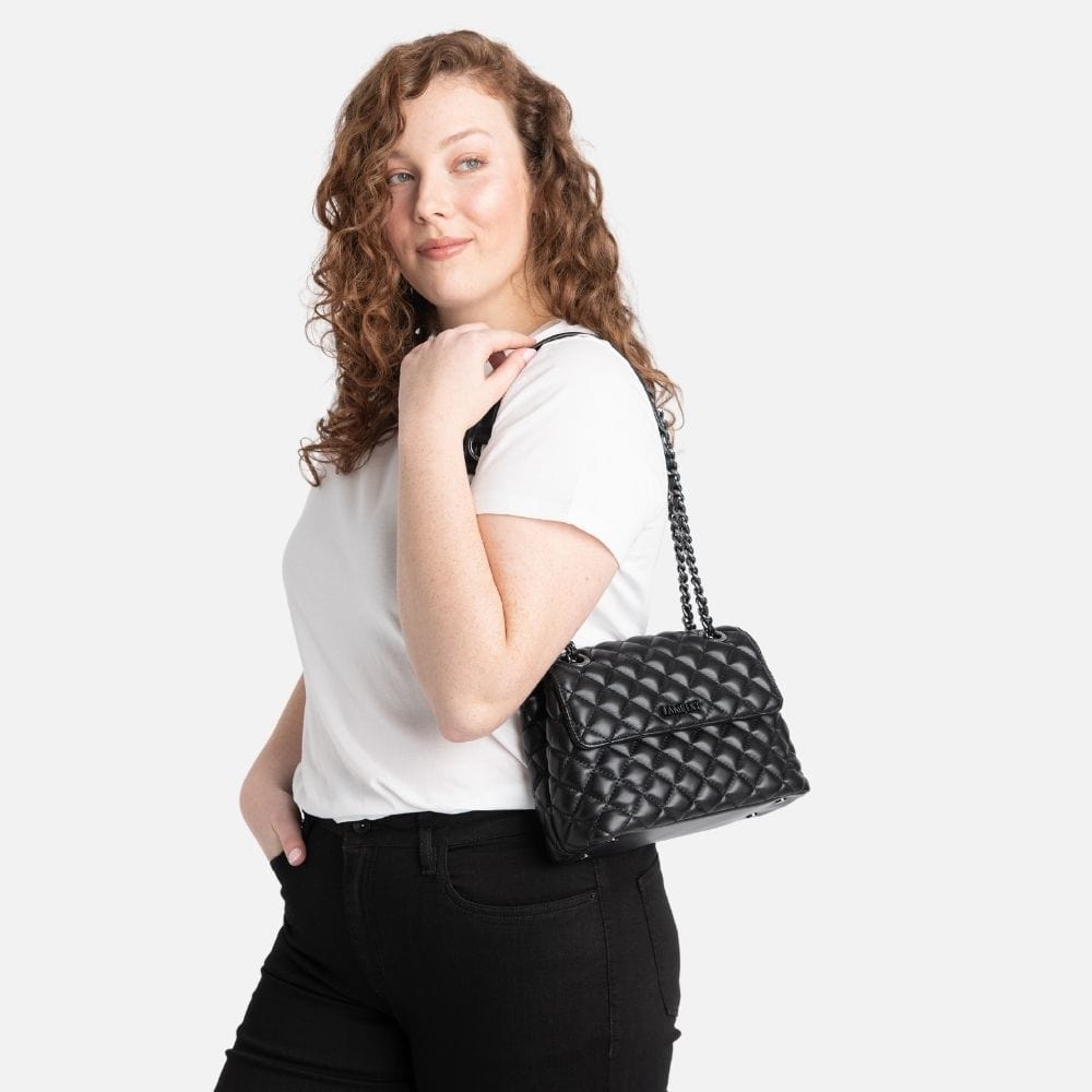 The Penelope features a doubled and braided chain strap and a quilted finish. Although compact, the interior has room for your cell phone, headphones, and other belongings. With a stylish flap silhouette, this 2-in-1 handbag can be worn on the shoulder or across the body. Just pull on one of the straps and there you have it!