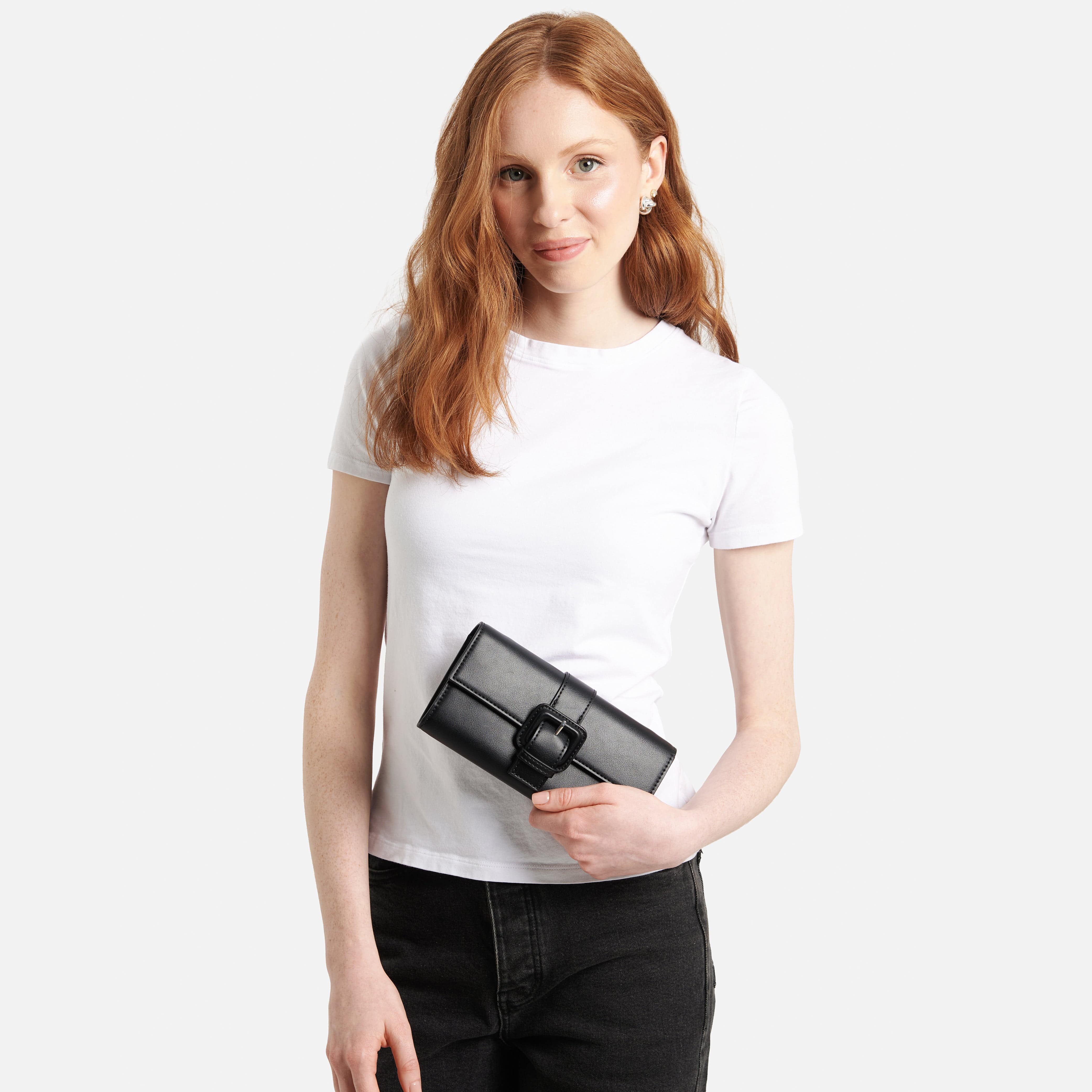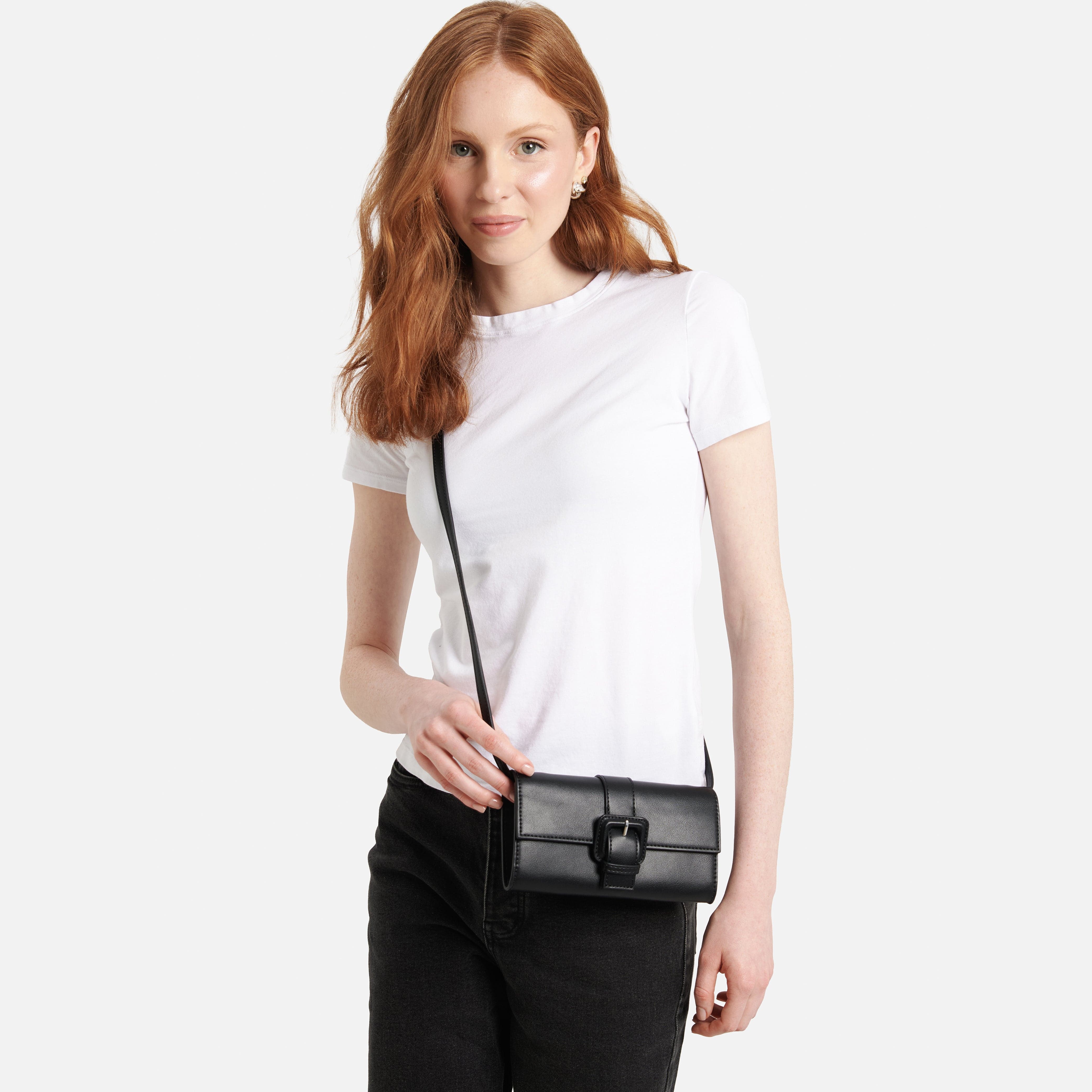 - Crossbody (with the adjustable, detachable vegan leather strap)